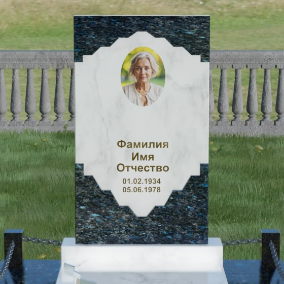 Данное ритуальное изделие представляет собой подлинный триумф художественного минимализма и гармонии контрастов. Центральным элементом композиции является вертикальная стела, выполненная в уникальной технике сочетания двух видов природного камня. Геометрия изделия строится на строгих, безупречно выверенных линиях внешнего контура и изысканной, фигурной резьбе внутреннего сегмента. Светлая вставка из мелкозернистого гранита, обрамленная темным камнем, напоминает античный портал или драгоценную раму, выполненную в стиле барокко. Фигурные фаски по краям светлого элемента создают ритмичный узор, который смягчает строгость прямоугольной формы, придавая мемориалу индивидуальность и торжественность.