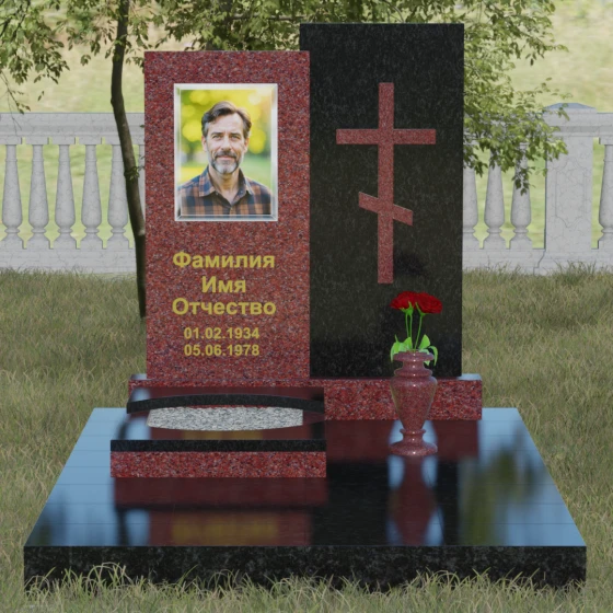 Данная модель представляет собой сложную двухкомпонентную конструкцию, построенную на гармонии противоположностей. Основной вертикальный элемент разделен на две части разного цвета и фактуры. Левая панель, выполненная из темного, глубокого камня, предназначена для центрального акцента — портрета и мемориальных надписей. Благодаря идеальной гладкости, гравировка здесь выглядит максимально четко, а портрет обретает фотографическую точность и одухотворенность. Правая часть композиции — это блок из светлого камня, на котором располагается лаконичный православный крест. Крест выполнен в строгом черном цвете, что создает мощный визуальный контраст на светлом фоне, подчеркивая духовную чистоту и значимость символа веры. Геометрия модели подчеркнуто строгая: прямые линии и четкие грани символизируют твердость характера и прямоту жизненного пути.