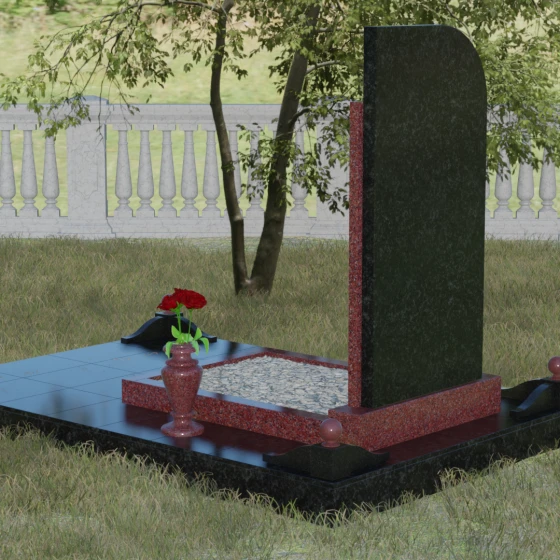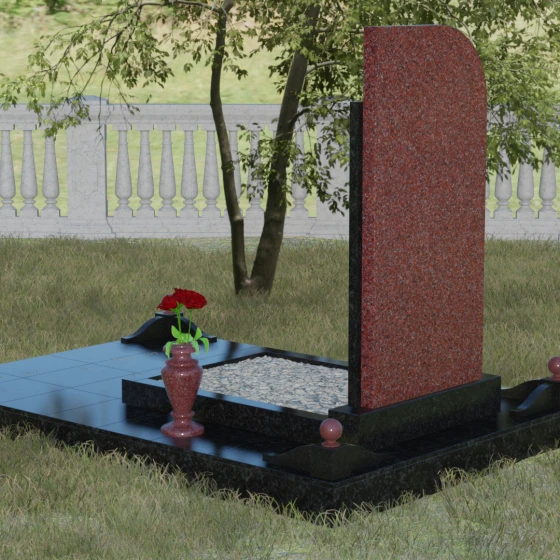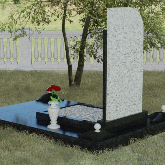Особое внимание уделено благоустройству основания. Памятник установлен на массивный гранитный цоколь, который служит надежным фундаментом и защищает конструкцию от перекосов со временем. Композиция дополнена изящной каменной вазой и декоративными элементами в виде шаров на подставках, выполненными в единой цветовой гамме с дополнительной колонной стелы. Такое комплексное решение создает законченный ансамбль, избавляя вас от необходимости дополнительно подбирать аксессуары. Гладкие, тщательно обработанные грани каждого элемента подчеркивают высокий статус изделия и его исключительную долговечность.