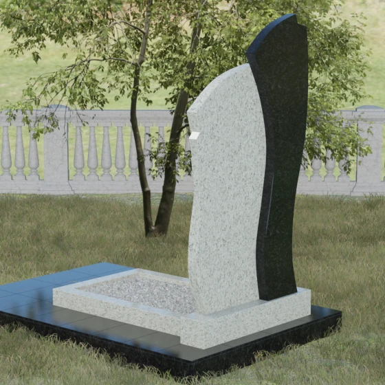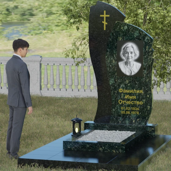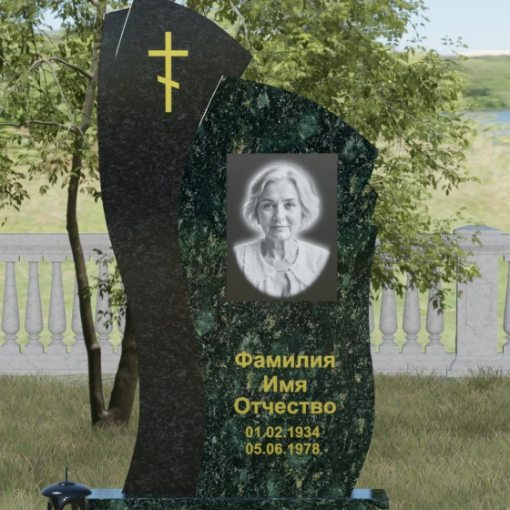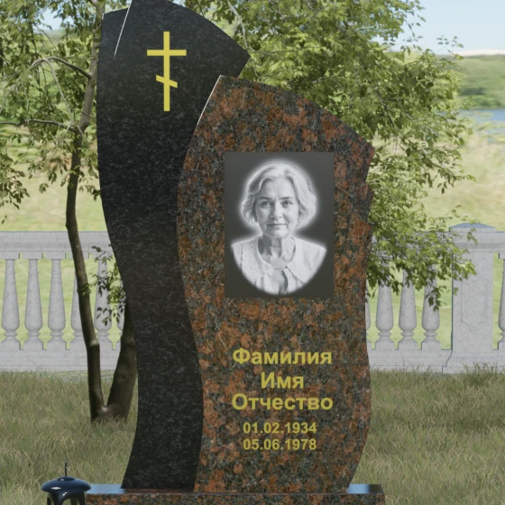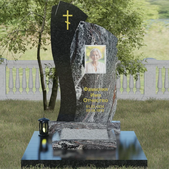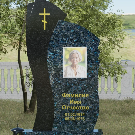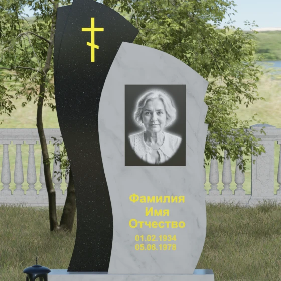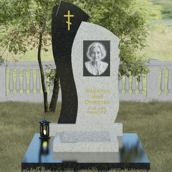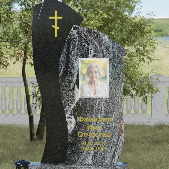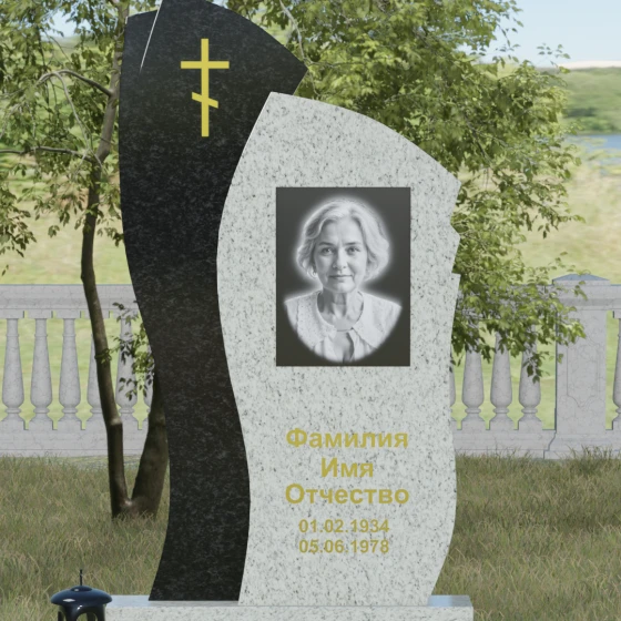 Данное ритуальное изделие представляет собой сложную художественную композицию, в которой мастерски обыгран контраст форм и материалов. В центре внимания — двухсоставная стела, объединяющая в себе мягкость восходящей линии и решительную геометрию скалы. Левый сегмент выполнен в виде изящной, тянущейся к небу волны из светлого камня, на которой лаконично расположился золоченый православный крест. Правая часть, служащая основанием для портрета, притягивает взгляд своей необычной обработкой: её внешний торец выполнен с каскадной, ступенчатой резкой, создающей эффект многослойности и глубины. Такая асимметрия символизирует сложность жизненного пути и возвышенность души.