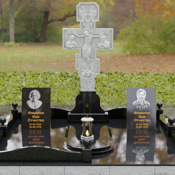 Данный мемориальный ансамбль представляет собой совершенный баланс между духовными традициями и современной архитектурной эстетикой. В центре композиции находится величественная стела в форме высокого православного креста, украшенного детальной многоуровневой резьбой. Барельефное изображение Распятия, выполненное с глубокой проработкой каждой детали — от складок плащаницы до ликов предстоящих, — создает ощущение покоя и благодати. Светлая, матовая фактура резного камня эффектно контрастирует с зеркально отполированными боковыми элементами, предназначенными для увековечивания памяти близких.