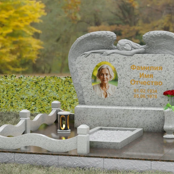 Геометрия комплекса продумана до мельчайших деталей, обеспечивая идеальный баланс форм. Горизонтальная ориентация стелы придает конструкции устойчивость и торжественность. Особое внимание уделено благоустройству прилегающего участка. Обелиск установлен на массивный гранитный цоколь, который не только приподнимает композицию над уровнем земли, но и защищает её от воздействия влаги. По периметру участок обрамлен изящным каменным ограждением: строгие столбики с пирамидальным завершением соединены плавными, волнообразными перемычками, повторяющими изгибы самой стелы. Вместо открытого грунта используется сплошная полированная плита с небольшим декоративным вырезом под цветник, заполненным белоснежной мраморной крошкой. Такое решение гарантирует эстетичный вид участка на десятилетия, полностью избавляя от необходимости борьбы с сорняками.