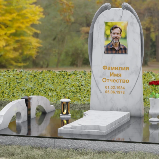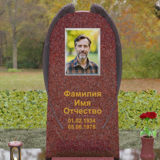 На широкой лицевой панели предусмотрено идеальное место для расположения портрета. Форма стелы позволяет гармонично вписать как классическую гравировку, так и цветной керамический медальон в овальной нише. Золоченая вырубка букв, как показано в образце, идеально сочетается с фактурной резьбой крыльев, делая надписи читаемыми и эстетически безупречными. Мы поможем вам подобрать именно то сочетание камня и декора, которое станет достойным отражением души того, кто вам дорог.