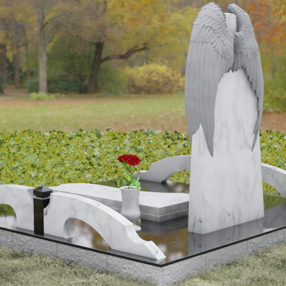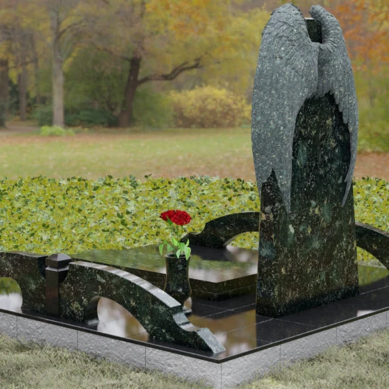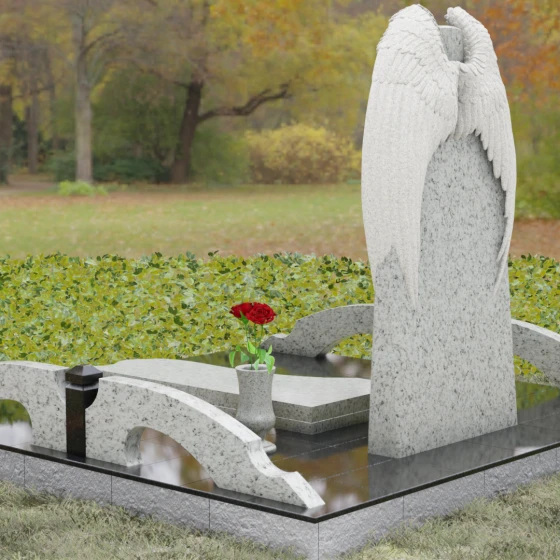 Данное ритуальное изделие (артикул 161) представляет собой подлинное воплощение тихой скорби и небесного покровительства. В центре художественной композиции находится вертикальная стела, которую бережно, словно в последнем земном объятии, обрамляют два резных ангельских крыла. Плавность изгибов этих элементов символизирует чистоту души и бесконечный жизненный путь, переходящий в вечный покой. Мастера уделили особое внимание детализации: каждое перышко на крыльях проработано с ювелирной точностью, создавая глубокий рельеф и объем, который эффектно контрастирует с идеально гладкой, зеркальной поверхностью основной части камня.
