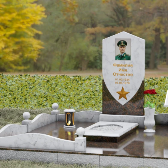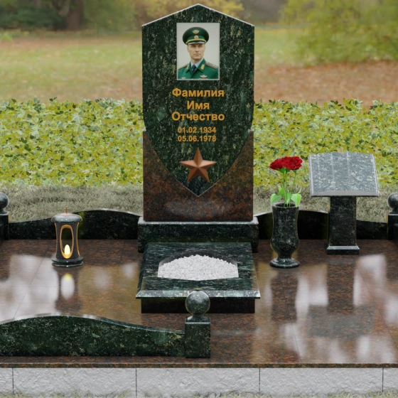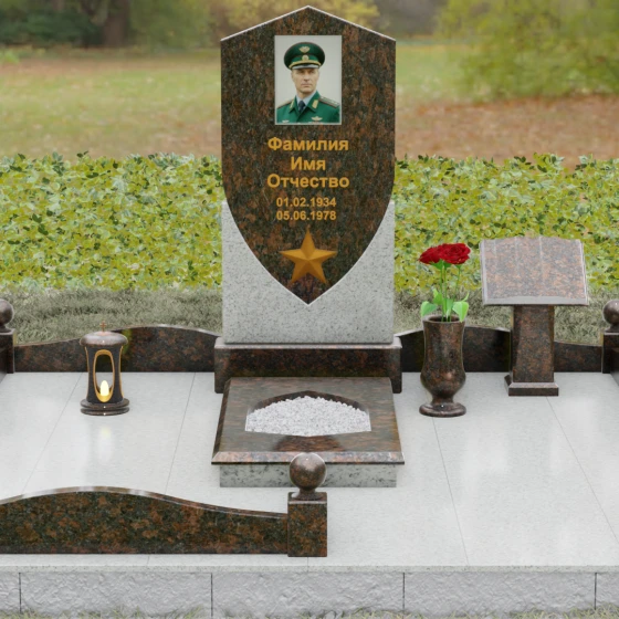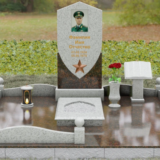 Особое внимание уделено деталям оформления: в нижней части «щита» расположен объемный бронзовый барельеф в виде пятиконечной звезды, символизирующей доблесть и служение отечеству. Благоустройство участка выполнено на высочайшем уровне: по периметру установлен низкий каменный цоколь, углы которого украшены массивными полированными столбиками с навершиями в виде идеальных шаров. Справа от основной стелы располагается дополнительный элемент — мемориальная плита в форме раскрытой книги на постаменте, предназначенная для нанесения эпитафий или памятных слов, что придает комплексу завершенный и гармоничный вид.
