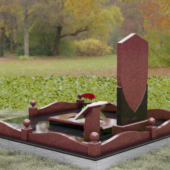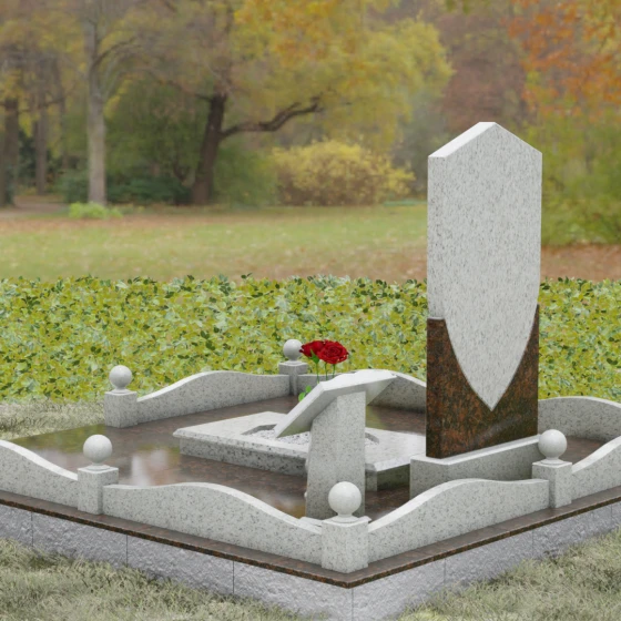 Центральным элементом композиции является вертикальная стела, выполненная в форме пятиугольного геральдического щита. Геометрия памятника сочетает в себе строгие прямые линии и четкие углы, что придает монументу выраженный мужской характер. Грани стелы обработаны широкими фасками, которые создают дополнительный объем и интересную игру света на зеркально отполированной поверхности камня. Нижняя часть стелы плавно переходит в массивное основание, выполненное из гранита контрастного оттенка с выраженной природной текстурой, что создает эффектный визуальный акцент.