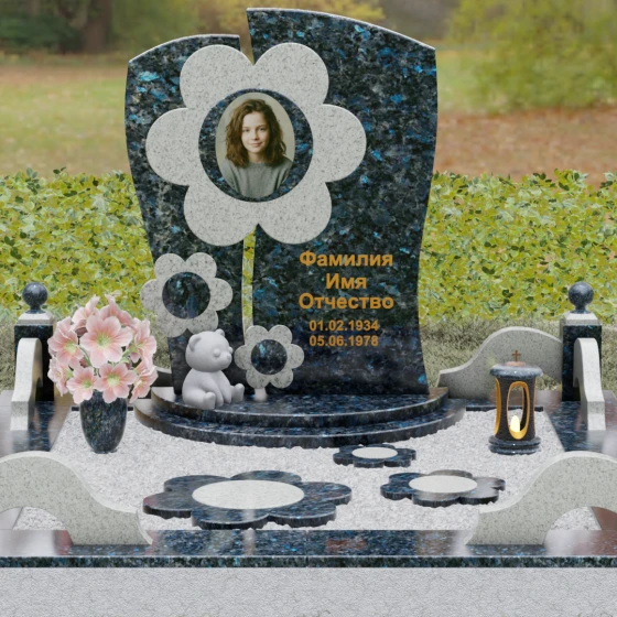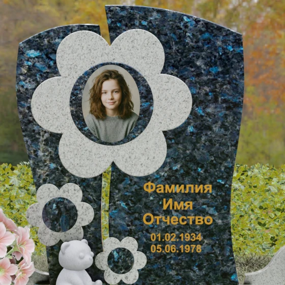Представленный мемориальный ансамбль (Артикул 241) — это не просто памятник, а подлинное художественное произведение, в котором застыла нежность и вечная весна. В центре композиции находится величественная стела, выполненная в уникальной комбинированной технике. Ее асимметричная форма с деликатным вертикальным разделением создает динамичный и в то же время гармоничный силуэт. Главным акцентом является искусно вырезанный из камня цветок, в сердцевину которого помещен портрет. Плавные, округлые лепестки символизируют чистоту и хрупкость жизни, а их объемная фактура создает удивительную игру света и тени, контрастируя с глубокой зеркальной полировкой основного полотна стелы.