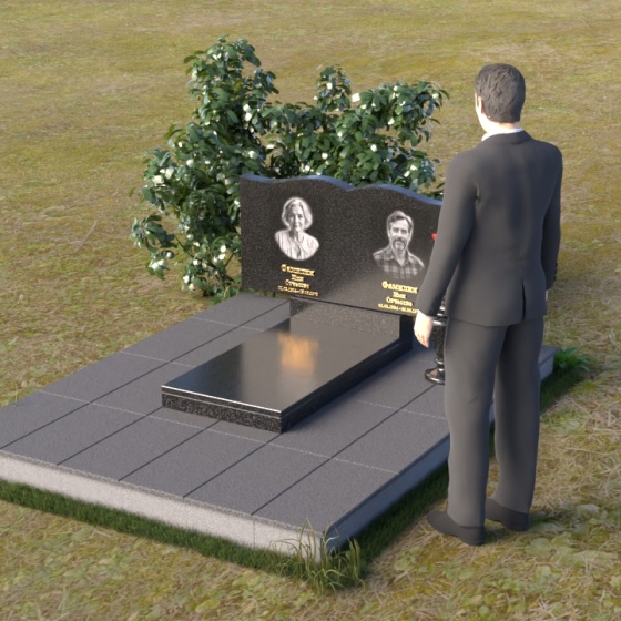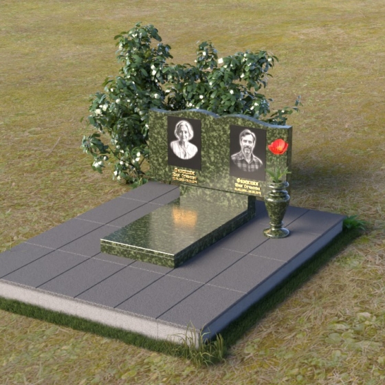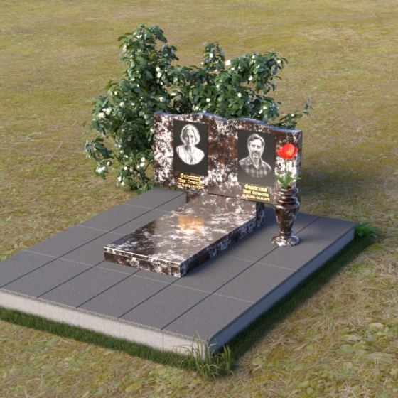 Этот гранитный монумент представляет собой вертикальную композицию, где основной акцент сделан на верхней части. Верхний край памятника имеет сложную, волнообразную форму, напоминающую плавные изгибы морской волны или нежные лепестки цветка. Этот элемент придает монументу легкость и изящество, смягчая строгость камня. Боковые грани монумента обработаны таким образом, чтобы подчеркнуть его вертикальность и стройность. Фаски по краям смягчают переход от лицевой поверхности к боковым, создавая ощущение завершенности и гармонии. Лицевая сторона монумента отполирована до зеркального блеска, отражая небо и окружающий мир, словно запечатлевая в себе вечность. На полированной поверхности выгравированы портреты усопших, выполненные с высокой степенью детализации. Под портретами расположены надписи с именами и датами жизни, выполненные строгим, элегантным шрифтом.