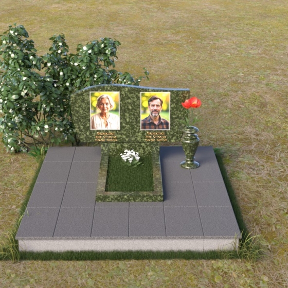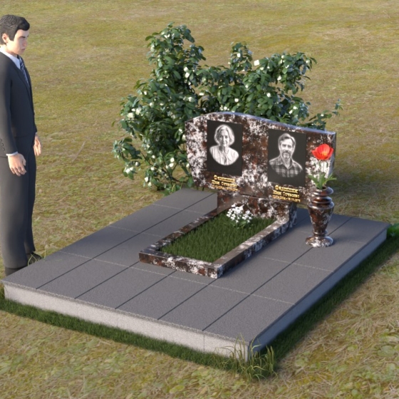 Этот памятник являет собой образец мастерства в обработке камня. Особое внимание привлекает игра контрастов: зеркально отполированный гранит, отражающий небо и окружающий мир, и деликатно выгравированные портреты усопших. Лаконичная ваза, выполненная в том же стиле, что и стела, гармонично дополняет композицию и служит местом для живых цветов, символизирующих вечную память и любовь.