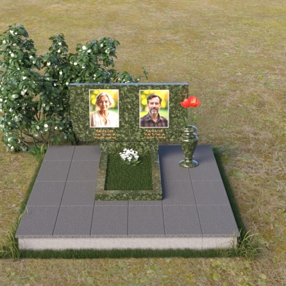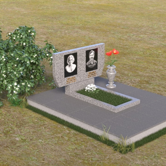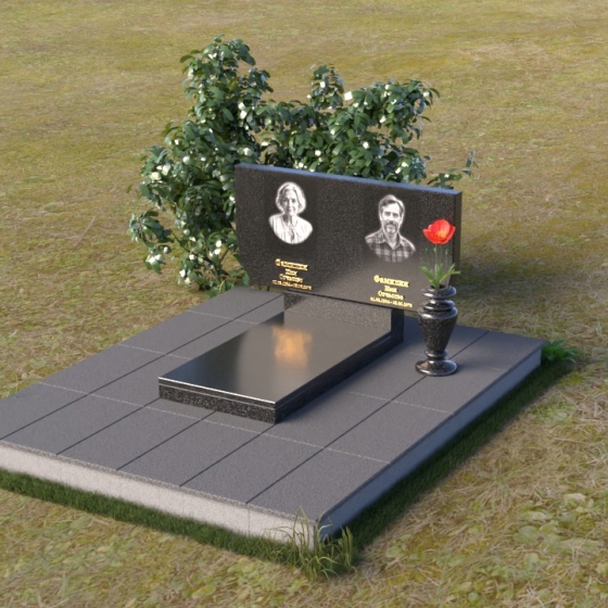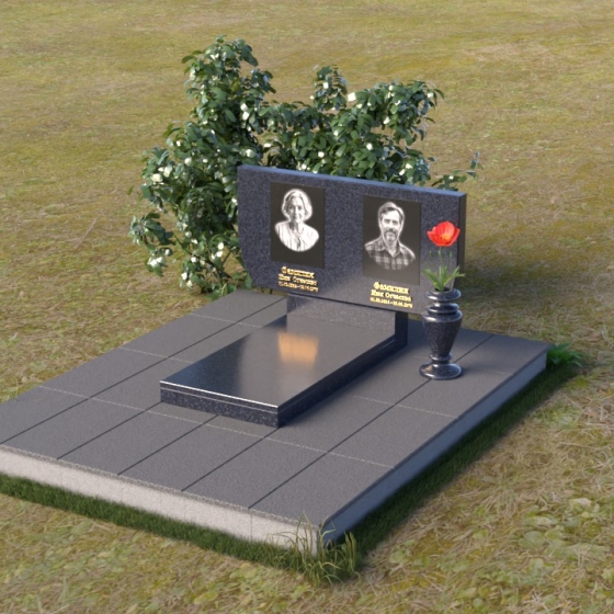 Памятник ПГ015 представляет собой композицию, состоящую из массивной стелы, горизонтальной плиты и тумбы. Стела, выполненная в форме прямоугольника со слегка скошенными верхними углами, создает ощущение надежности и основательности. Зеркальная полировка камня придает ей благородный блеск, отражая свет и создавая игру теней, подчеркивающую глубину и объем. На стеле располагаются два портрета, выполненные с высокой точностью, а также памятные надписи, выполненные золотым шрифтом. Справа от портретов, словно символ вечной памяти, размещена небольшая ваза, в которой можно разместить живые или искусственные цветы.
