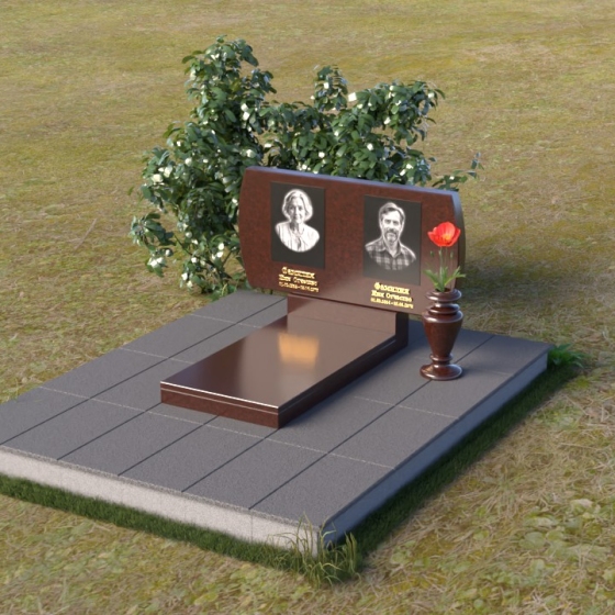 Композиция памятника строится на контрасте строгих геометрических форм и плавных линий, создавая гармоничный и запоминающийся образ. В верхней части возвышается стела из черного гранита, чья зеркальная полировка отражает небо и окружающий мир, словно напоминая о связи земного и небесного. Верхние углы стелы скруглены, смягчая строгость формы и придавая ей более мягкий, человечный облик. На стеле размещены портреты усопших, выполненные с высокой точностью и передающие их индивидуальность. Золотистые надписи имен и дат словно светятся на фоне черного камня, добавляя торжественности и значимости. У подножия стелы располагается горизонтальная плита, также выполненная из полированного черного гранита, создающая ощущение завершенности и устойчивости. Рядом – изящная ваза из того же материала, предназначенная для живых цветов, символа неувядающей памяти и любви.