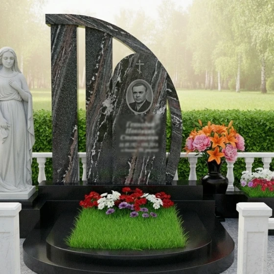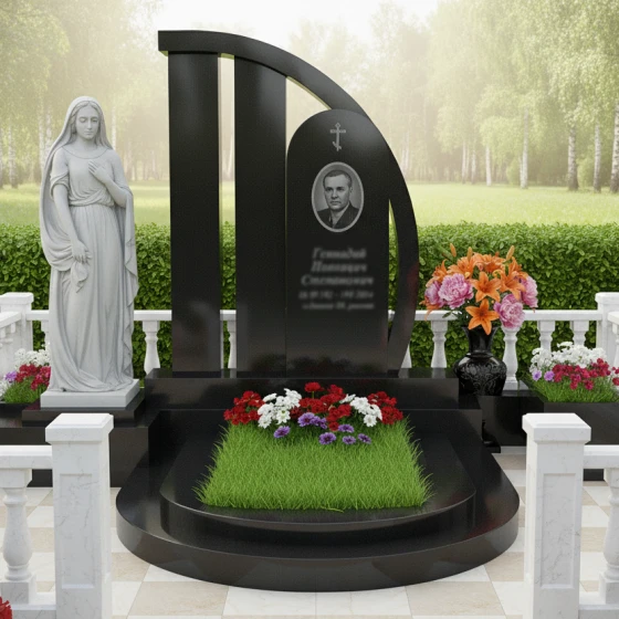 В основе мемориальной композиции лежит элегантная стела, чья геометрия представляет собой гармоничное сочетание строгих линий и мягких изгибов. Основная часть стелы выполнена в виде вертикального прямоугольника, символизирующего стойкость и незыблемость памяти. С правой стороны к ней примыкает вторая, более изящная часть, выполненная в форме плавно изогнутой арки, которая словно обнимает центральный элемент. Эта арка, устремленная вверх, может интерпретироваться как символ небесного свода или пути души к вечности. Внутри этой арки, на идеально отполированной поверхности, размещена овальная ниша для портрета, обрамленная тонкой, но выразительной гравировкой, придающей изображению особую значимость. Грани стелы безупречно обработаны, создавая игру света и тени, подчеркивающую глубину черного камня. Важным элементом является также аккуратно вырезанный лаконичный православный крест, расположенный в верхней части арки, который служит символом веры и надежды.