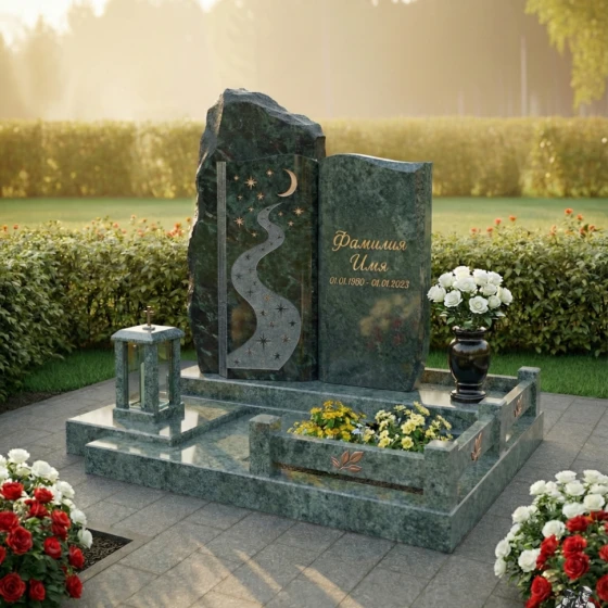 Монумент установлен на массивный, многоуровневый гранитный цоколь, который не только придает всей конструкции исключительную устойчивость, но и формирует завершенную архитектурную композицию. Нижний уровень цоколя имеет широкую, полированную поверхность, создающую ощущение надежности и прочности. Следующий уровень, чуть более узкий, создает эффект ступеней, ведущих к самим стелам. Надгробная плита, выполненная в едином стиле с цоколем и стелами, закрывает всю площадь захоронения, что не только придает участку ухоженный и законченный вид, но и значительно упрощает уход за ним, избавляя от необходимости прополки и поддержания чистоты. По периметру надгробной плиты расположены изящные бортики, образующие две прямоугольные клумбы, предназначенные для живых цветов. В них уже высажены яркие композиции, символизирующие жизнь и память. Дополнительно, в композицию включены элегантная гранитная ваза для цветов, выполненная в той же зеркальной полировке, что и правая стела, и изящный каменный подсвечник-фонарь, который позволяет разместить лампадку, создавая атмосферу уюта и вечной памяти.