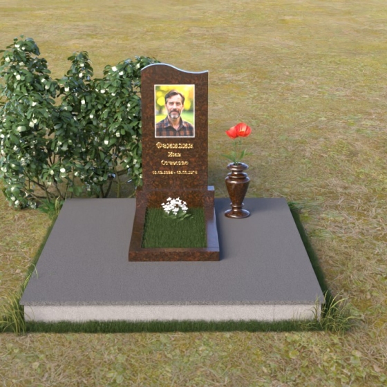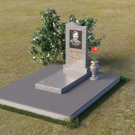 Представленная мемориальная композиция отличается лаконичностью и элегантностью. Ее строгие формы, смягченные плавными изгибами, символизируют как жизненный путь, так и обретение покоя. Верхняя часть стелы имеет мягкий, едва заметный изгиб, словно склоняясь в знак уважения. Грани стелы деликатно обработаны, что придает ей завершенный и благородный вид. На лицевой стороне выгравированы портрет усопшего и памятные надписи, выполненные с особой тщательностью.