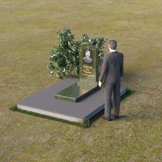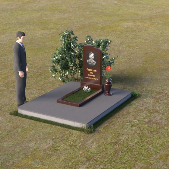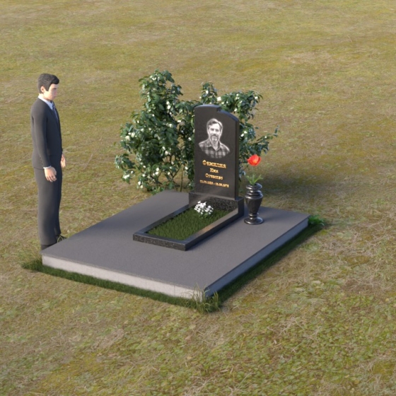 Геометрия модели продумана до мельчайших деталей. Начиная с основания, мы видим широкую плиту, обеспечивающую устойчивость всей конструкции. На ней возвышается горизонтальная плита меньшего размера, выполненная в зеркальной полировке, отражающая небо и окружающий мир, словно запечатлевая в себе мгновения жизни. Вертикальная стела, возвышающаяся над плитой, имеет сглаженные углы и плавные переходы, смягчающие строгость формы. Верхняя часть стелы, с ее деликатными сколами, придает ей уникальность и неповторимость. Рядом со стелой располагается небольшая ваза, выполненная в том же стиле, предназначенная для живых цветов, символизирующих вечную память и любовь.