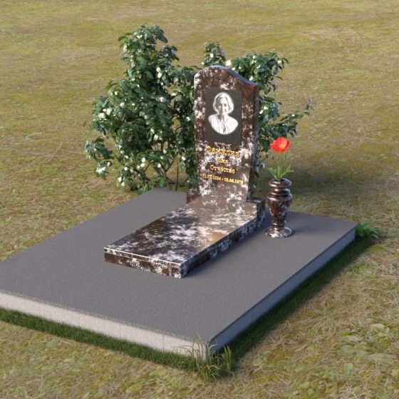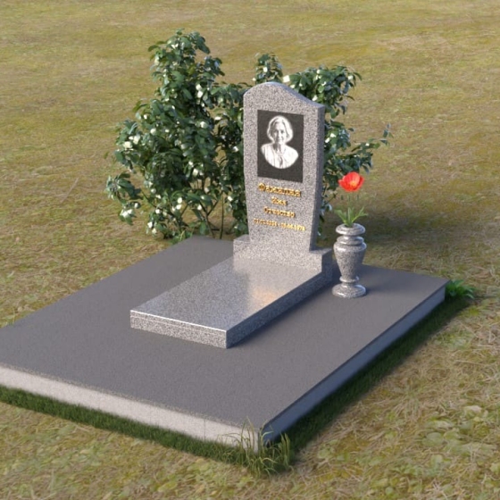 Форма стелы, тяготеющая к классической прямоугольной, предоставляет широкие возможности для персонализации. Портрет усопшего, расположенный в верхней части, будет выгодно подчеркнут лаконичной формой камня. Золотистое начертание имени и дат жизни, выполненное с особым вниманием к деталям, отчетливо выделяется на фоне полированного гранита, создавая четкий и легко читаемый текст. Дополнительно можно разместить эпитафию или памятные слова, которые отразят личность и жизненный путь ушедшего человека. Маленькая гранитная ваза, выполненная в едином стиле с мемориальной композицией, станет достойным обрамлением для живых цветов, привносящих нотку жизни и надежды.