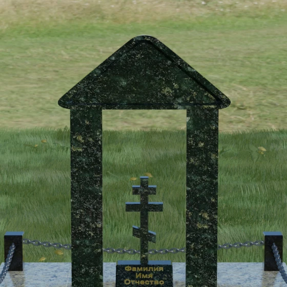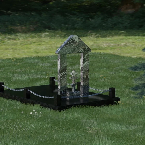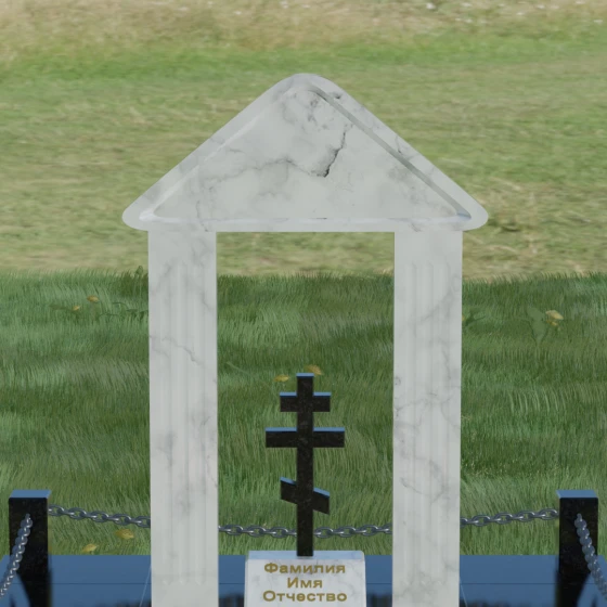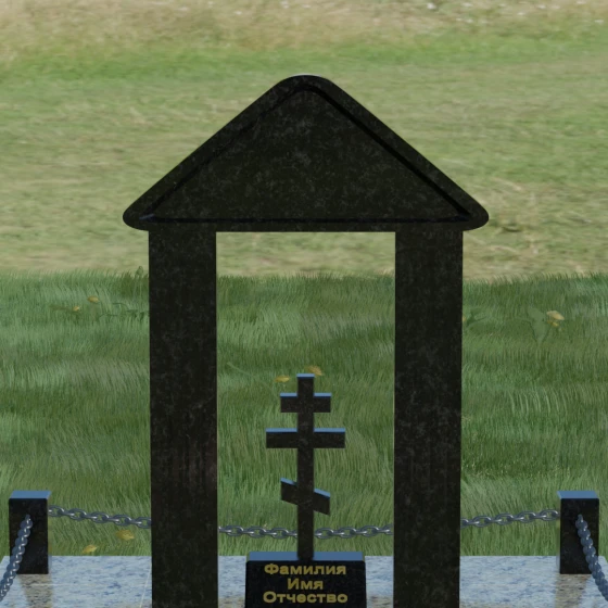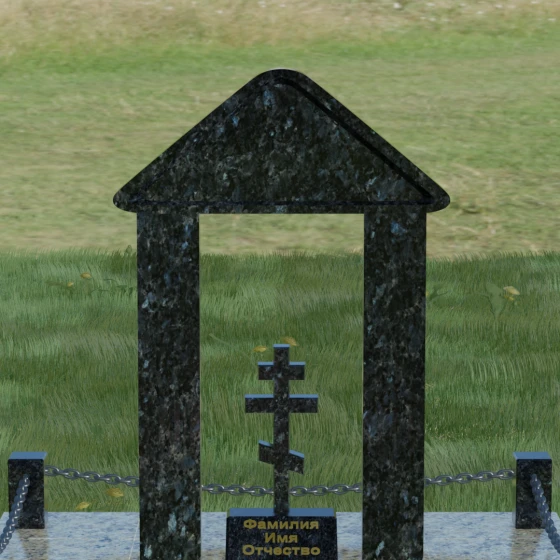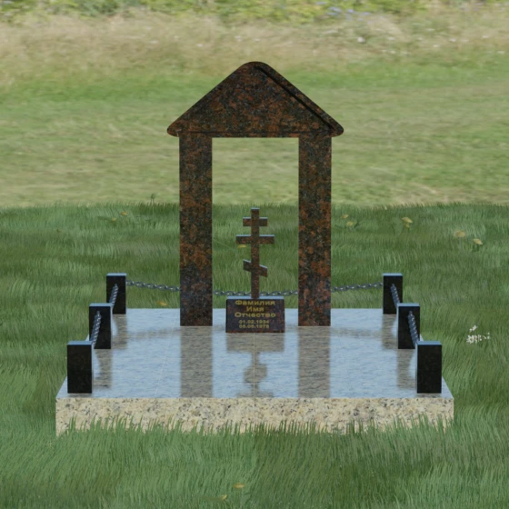 Модель №053 — это не просто памятник, а величественный мемориальный ансамбль, выполненный в лучших традициях храмового зодчества. Центральное место в композиции занимает надгробие из натурального камня, спроектированное в форме открытой арки или стилизованной часовни. Такая архитектурная форма символизирует небесные врата и покровительство высших сил. Внутри арочного свода, на отдельном постаменте, возвышается канонический православный восьмиконечный крест. Его строгие, безупречно выверенные пропорции подчеркивают глубокую веру и смирение, а объемная резьба придает элементу особую значимость. Массивное треугольное навершие (фронтон) венчает конструкцию, создавая ощущение завершенности и монументального спокойствия.