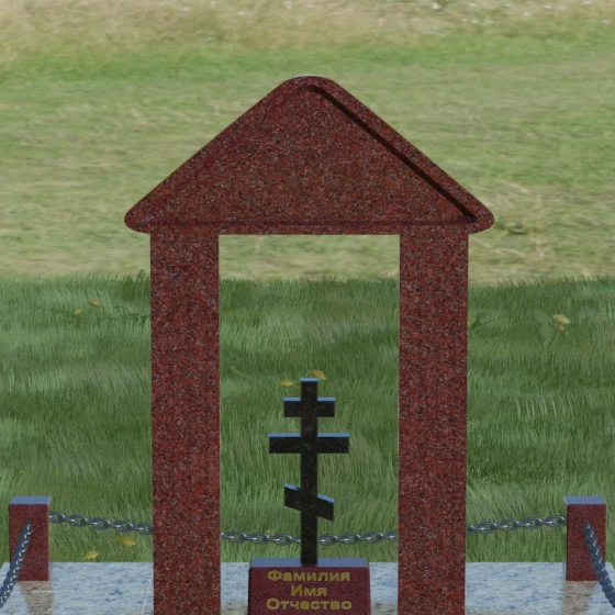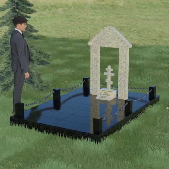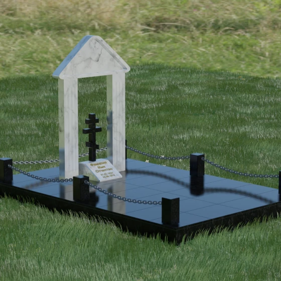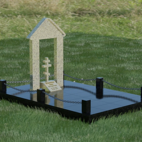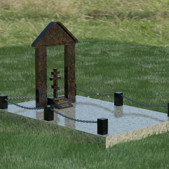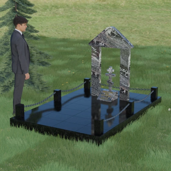 Эстетика данного комплекса строится на игре объемов и безупречной обработке каждой грани. Мастер-камнерез уделяет особое внимание полировке: зеркальный блеск основных плоскостей контрастирует с глубокими фасками и фальцами, которые подчеркивают геометрию арки. Благоустройство участка продумано до мелочей. Вся прилегающая территория закрыта сплошной полированной плитой, что не только придает мемориалу "дорогой" и законченный вид, но и гарантирует чистоту участка на десятилетия. Периметр обозначен строгими каменными столбиками, соединенными декоративными цепями, что создает четкую визуальную границу священного пространства и защищает его от внешних воздействий.