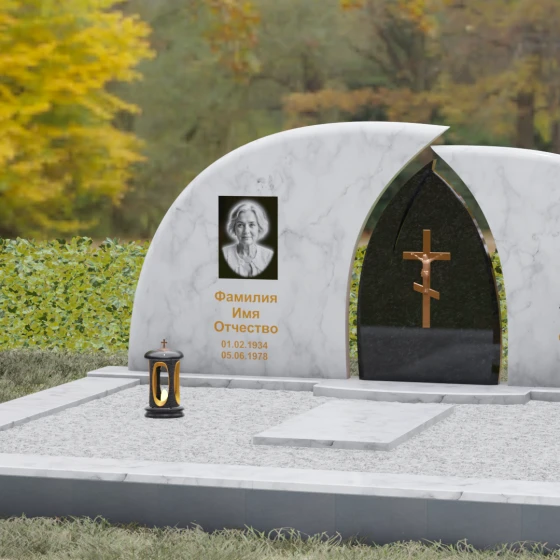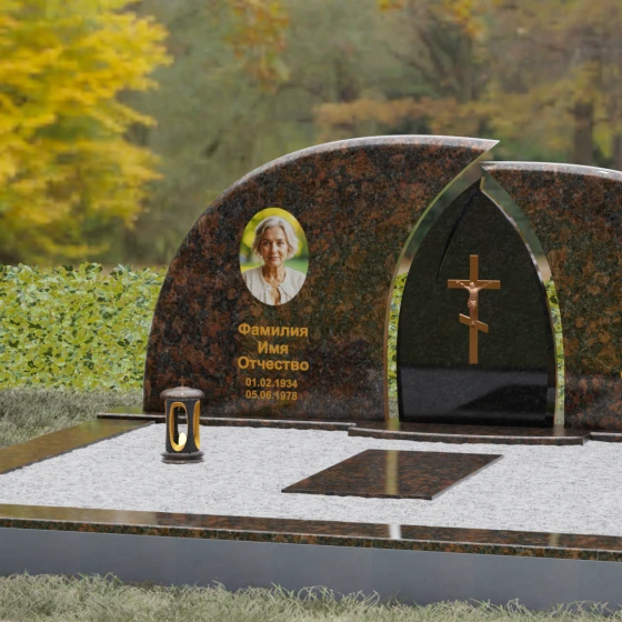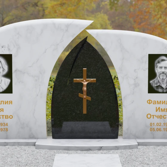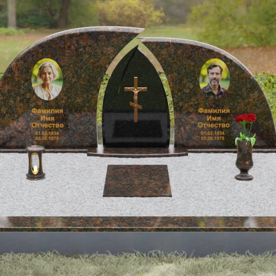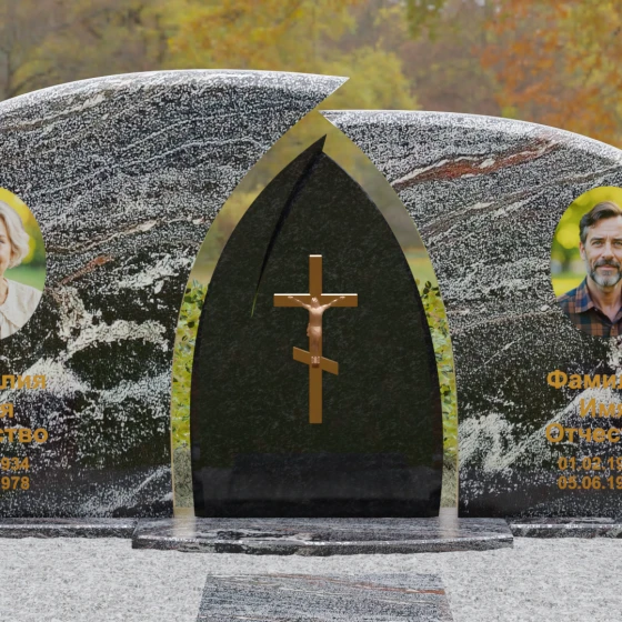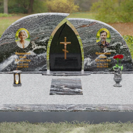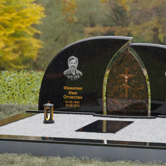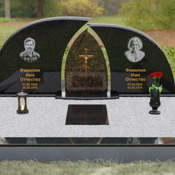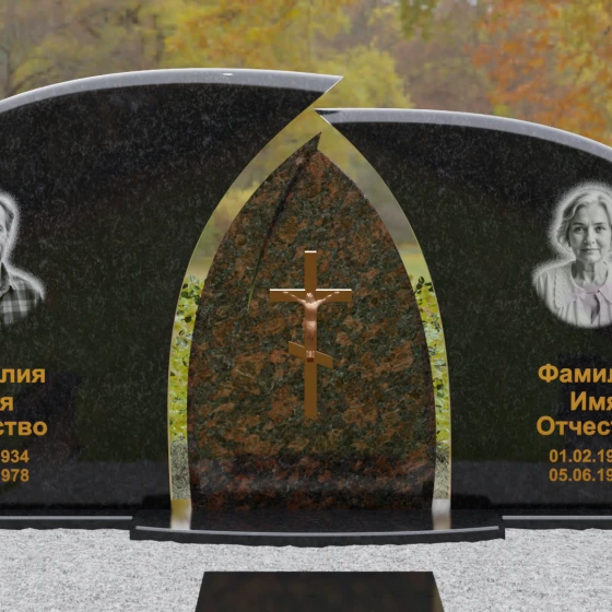 Оформление: Форма стелы идеально подходит для парных захоронений. Благодаря большой полезной площади полированных плит, портреты можно расположить симметрично, используя как классическую гравировку, так и цветную фотокерамику. Золоченая гравировка ФИО будет особенно эффектно смотреться на темном фоне, перекликаясь с цветом центрального креста и создавая цельный, дорогой образ.