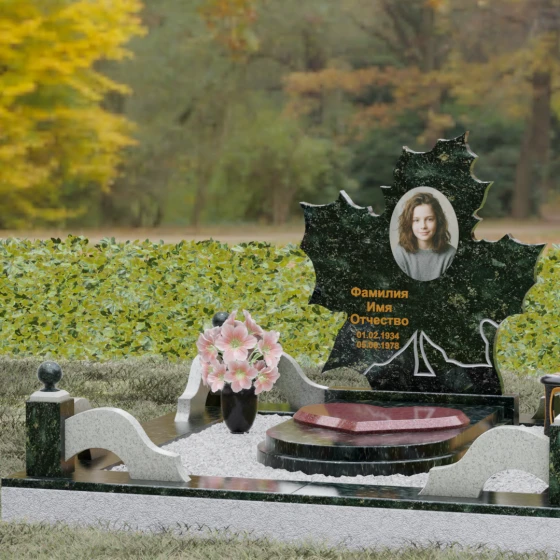 Данная мемориальная композиция — это воплощение глубокого уважения и вечной памяти, облаченное в художественную форму. Выбор формы кленового листа не случаен: в мировой символике он олицетворяет силу духа, красоту жизненного пути и мудрость. Каждая линия этой стелы пропитана эстетикой природного изящества. Резные края листа выполнены с филигранной точностью, создавая сложный, многогранный силуэт, который выделяется на фоне классических строгих форм. Плавные изгибы и отсутствие агрессивных углов призваны дарить чувство покоя и умиротворения, подчеркивая, что душа близкого человека обрела вечный приют в гармонии.
