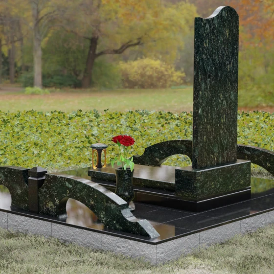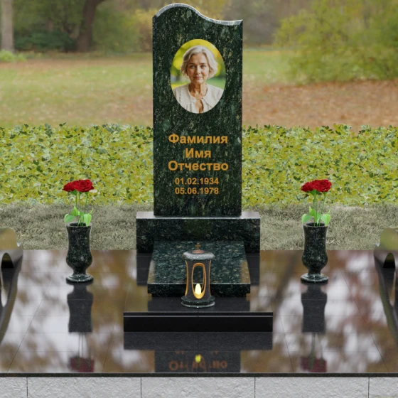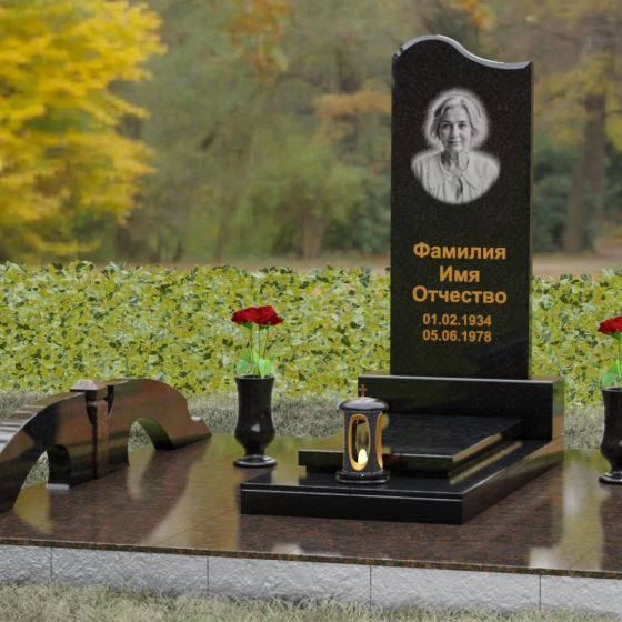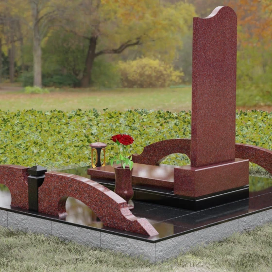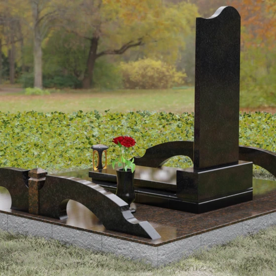 Данная мемориальная композиция предполагает целостное оформление участка. Стела устанавливается на массивный каменный постамент, который служит надежным фундаментом и придает всей конструкции величественность. В едином ансамбле с основным монументом могут быть выполнены изящные вазы, расположенные по бокам. Эти элементы декора, выточенные из того же благородного материала, позволяют всегда содержать место памяти в порядке, украшая его живыми цветами. Использование цельных каменных элементов в основании исключает прорастание сорной травы и значительно упрощает уход, сохраняя первозданный вид комплекса на десятилетия.