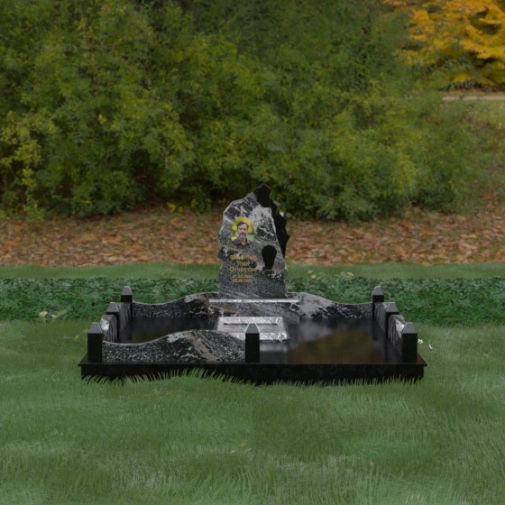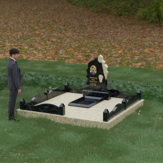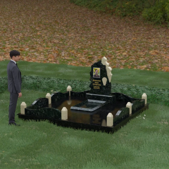 Особого внимания заслуживает художественное решение ограждения. Вместо стандартных прямых линий здесь используются плавные волнообразные изгибы боковых панелей цоколя, которые смягчают общую строгость конструкции. Периметр участка акцентирован массивными квадратными столбиками, увенчанными аккуратными пирамидальными навершиями из контрастного светлого камня. Это создает ритмический архитектурный рисунок, превращая место захоронения в обособленное, защищенное пространство, пропитанное атмосферой покоя и светлой грусти. Плавность линий в сочетании со строгими вертикальными акцентами делает этот мемориал универсальным и эстетически совершенным решением для достойного увековечивания памяти.