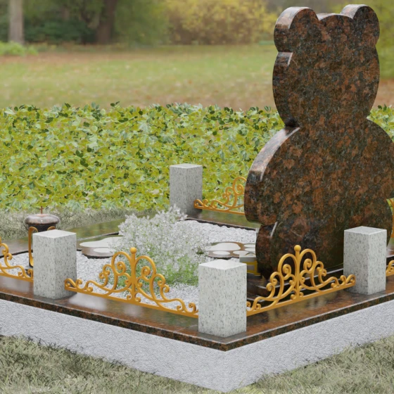 Представленное надгробие из натурального камня (Артикул 235) — это подлинное произведение мемориального искусства, в котором монументальность гранита встречается с трогательной нежностью художественного образа. Силуэт памятника выполнен в форме стилизованной фигуры медвежонка, что мгновенно переводит восприятие из плоскости строгой скорби в область светлых, чистых воспоминаний о невинности и искренности. С точки зрения искусствоведа, выбор такой формы является глубокой аллегорией вечной защиты и неувядающей любви: округлые, мягкие линии стелы лишены острых углов, что символизирует бесконечность и гармонию.