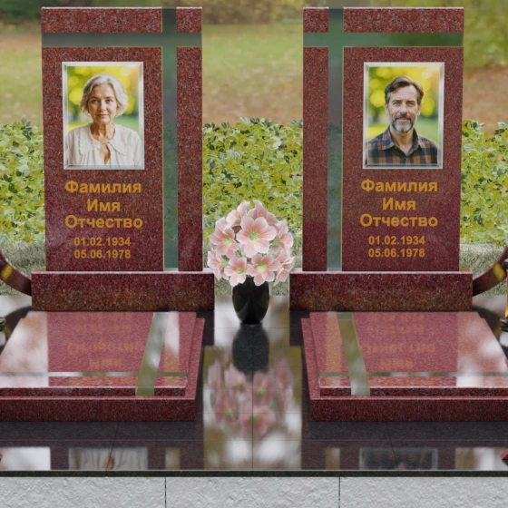 Данная величественная мемориальная композиция представляет собой не просто место упокоения, а подлинное произведение архитектурного искусства, призванное увековечить глубокую связь между двумя душами. Дизайн изделия строится на гармонии строгих вертикальных линий и изящных декоративных элементов, создавая атмосферу благородного спокойствия и вечного почтения. В центре ансамбля расположены две симметричные стелы, объединенные общим основанием, что символизирует неразрывность уз и жизненного пути, пройденного рука об руку. Особое внимание привлекает лаконичная резьба в верхней части плит: пересекающиеся глубокие борозды образуют строгий, геометрически выверенный крест. Этот символ веры и смирения не выступает отдельной деталью, а является неотъемлемой частью самого камня, подчеркивая монументальность и целостность всего надгробия.