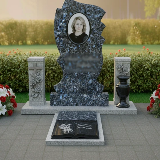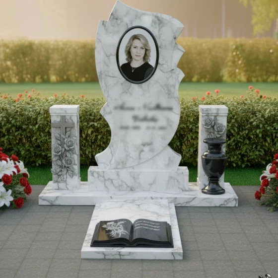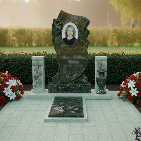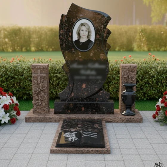 Этот мемориальный комплекс представляет собой изысканное сочетание плавных линий и символических образов, создающее атмосферу светлой грусти и вечной памяти. Изящные изгибы стелы словно обрамляют воспоминания, а раскрытая книга у основания символизирует историю жизни, полную событий и чувств. Модель доступна в восьми вариантах исполнения- от строгого черного гранита до нежного мрамора Тассос, что позволяет создать мемориал, отражающий индивидуальность усопшего.