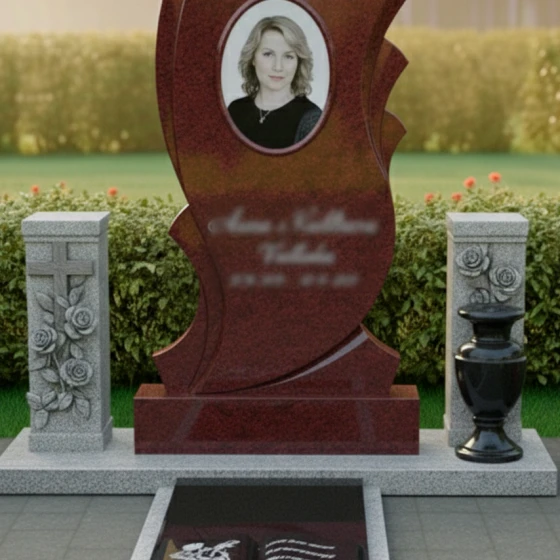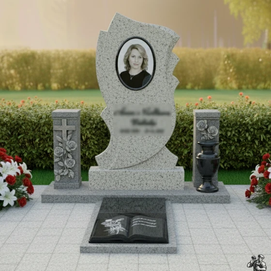 • Стела: Фигурная стела с плавными волнообразными вырезами по бокам, создающими динамичный и запоминающийся силуэт. Овальная ниша предназначена для размещения портрета.