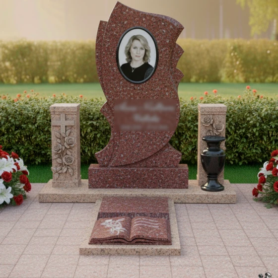 • Надгробная плита: Горизонтальная плита в форме раскрытой книги с выгравированным цветочным мотивом, символизирующим красоту и хрупкость жизни.
