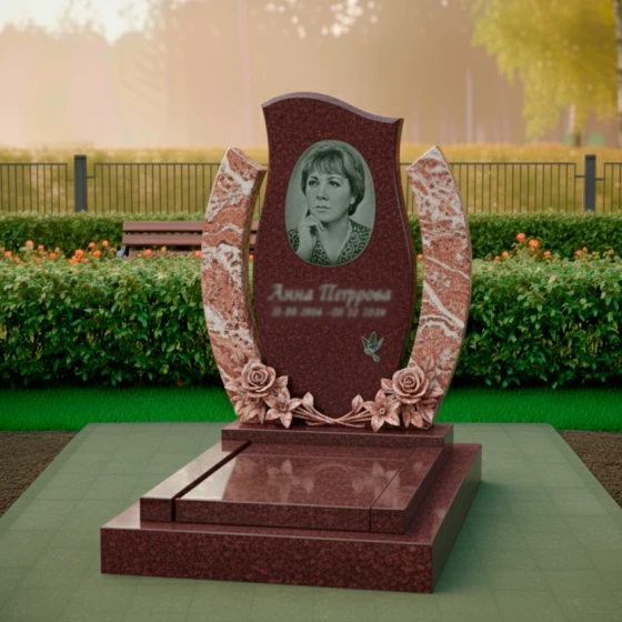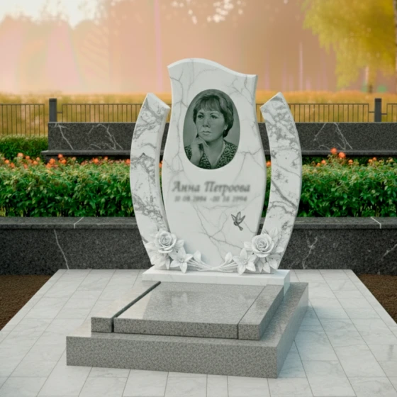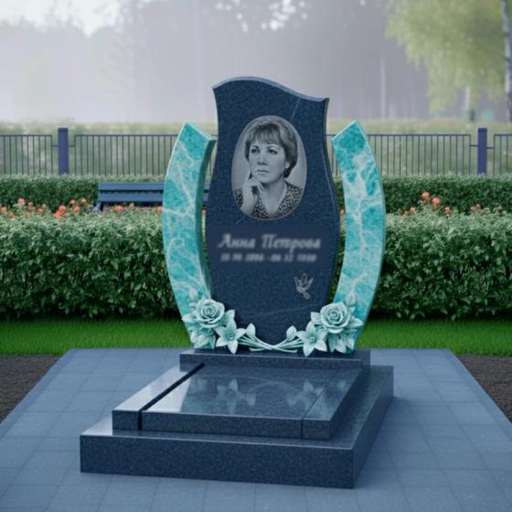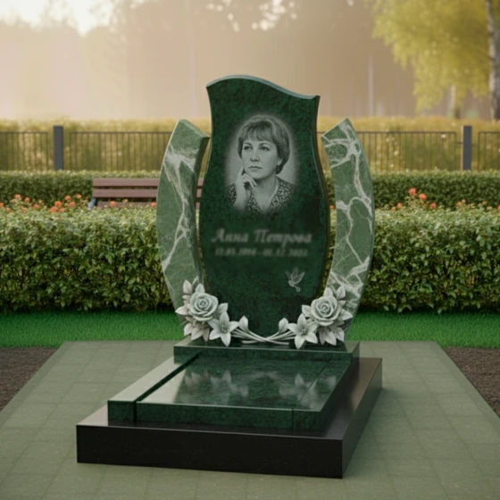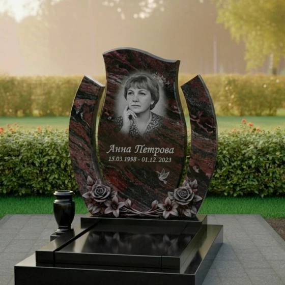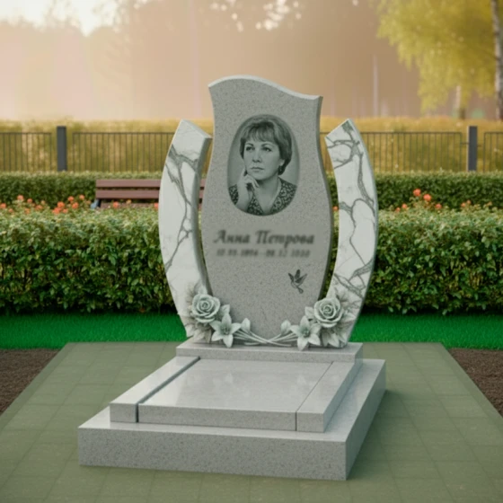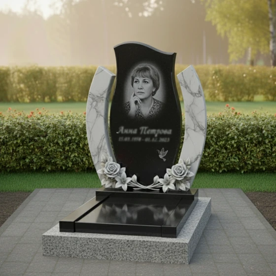 Центральная стела представляет собой произведение искусства, где строгость классических линий изящно переплетается с плавными, органичными формами. Ее верхняя часть выполнена в виде мягкой, волнообразной кривой, напоминающей о непрерывности жизненного цикла и бесконечности памяти. Эта плавная линия создает ощущение спокойствия и умиротворения, словно волны, нежно омывающие берег вечности. Боковые грани стелы мастерски обработаны, образуя зеркально полированные поверхности, которые ловят и отражают каждый луч света, создавая динамичную игру бликов и теней. Этот эффект придает изделию невероятную глубину и объем, заставляя камень буквально оживать под взглядом. На черном, глубоко полированном фоне стелы, где отражается мир вокруг, выгравирован портрет усопшего — лик, запечатленный с поразительной детализацией и выразительностью, словно живое изображение, сотканное из света и тени. Под портретом аккуратно расположены даты жизни и имя, выполненные элегантным шрифтом, а в нижней части стелы распускается изысканная резьба в виде двух роз, символизирующих красоту и нежность. Их лепестки, выполненные с ювелирной точностью, имеют матовую, шелковистую фактуру, которая контрастирует с глянцевой поверхностью стелы, создавая эффект объема и реалистичности. Между розами парит лаконичный, но выразительный символ – голубь, воплощение душевного покоя и вечного полета души. Эти элементы резьбы, выполненные в светлом граните, создают поразительный контраст с темной полировкой основной стелы, подчеркивая каждый изгиб и придавая композиции особую выразительность. Дополнительные боковые элементы из светлого гранита с характерными мраморными прожилками, обхватывающие центральную стелу, придают комплексу дополнительную массивность и архитектурную завершенность. Их изогнутая форма и полированная поверхность создают эффект обволакивания, защиты, словно крылья, оберегающие покой усопшего. Эти элементы подчеркивают величественность и уникальность всего ритуального изделия.