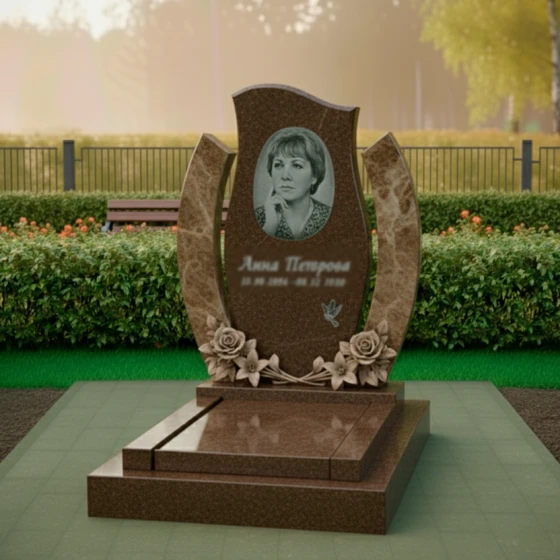 Форма данного ритуального изделия глубоко символична. Плавные линии верхней части стелы олицетворяют покой и умиротворение, напоминая о цикличности жизни и бесконечности бытия. Изогнутые боковые элементы, обрамляющие центральную часть, создают ощущение защиты и нежности, словно объятия, оберегающие покой усопшего. Весь ансамбль выражает идею вечной памяти, нерушимой связи между мирами и глубокого уважения к ушедшему. Это место, где скорбь переплетается с надеждой, а память о прошлом становится источником силы для будущего. Благоустройство участка также продумано до мелочей. Ритуальное изделие установлено на массивный, но элегантный гранитный цоколь, который не только придает всей конструкции устойчивость и монументальность, но и формирует четкие границы мемориального пространства. Надгробная плита, выполненная в едином стиле с основной стелой, полностью закрывает участок, создавая ощущение законченности и безупречности. Такое решение значительно упрощает уход за местом захоронения, сохраняя его опрятный и ухоженный вид на долгие годы. Отсутствие открытого грунта предотвращает рост сорняков и обеспечивает легкость в поддержании чистоты, что является важным аспектом для сохранения достойного облика места памяти.