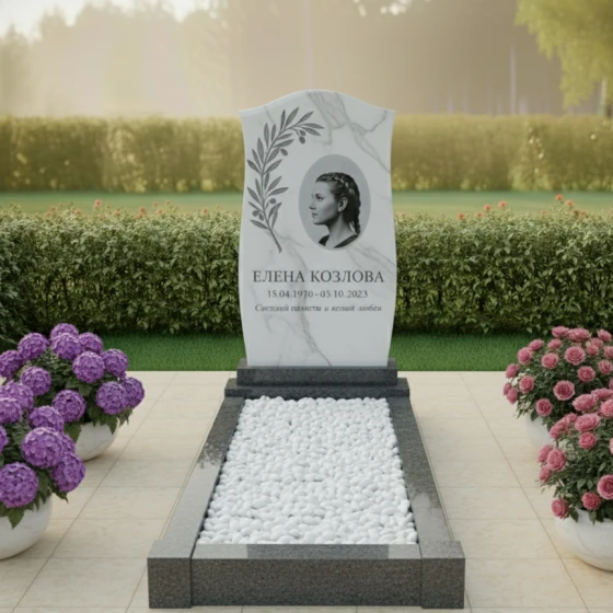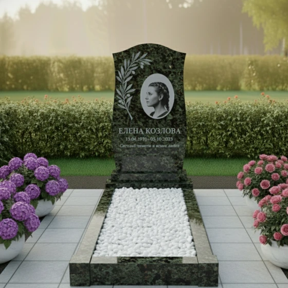 Кому подойдет: Данная модель обладает универсальной, но глубоко символичной эстетикой. Плавные линии навершия и растительный орнамент делают этот монумент идеальным выбором для увековечивания памяти женщины — матери, бабушки или супруги, подчеркивая её нежность и заботу при жизни. В то же время, монументальность гранита, строгость форм и лаконичность исполнения позволяют установить его на могиле мужчины, символизируя его твердый характер и благородство души. Это выбор тех, кто ищет баланс между строгой классикой и художественной выразительностью, желая создать на месте упокоения атмосферу светлой грусти и вечного покоя.