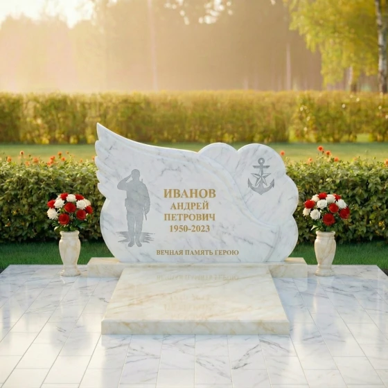 Центральная часть стелы представляет собой элегантную черную полированную поверхность, идеальную для нанесения портрета и данных усопшего. Здесь же, методом глубокой гравировки, прорисован силуэт воина, отдающего честь, что придает композиции особую торжественность и дань уважения. Правая часть стелы оформлена в виде облака с рельефным изображением якоря — символа надежды, верности и стабильности, часто ассоциирующегося с морской службой или жизненной стойкостью. Этот элемент выполнен из светлого, матового камня, создавая выразительный контраст с полированной черной основой и подчеркивая фактурное разнообразие материала.