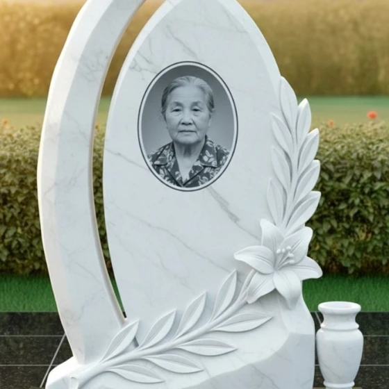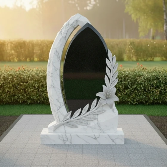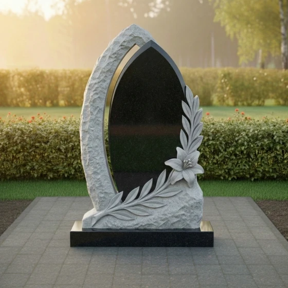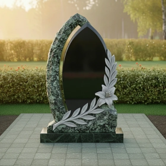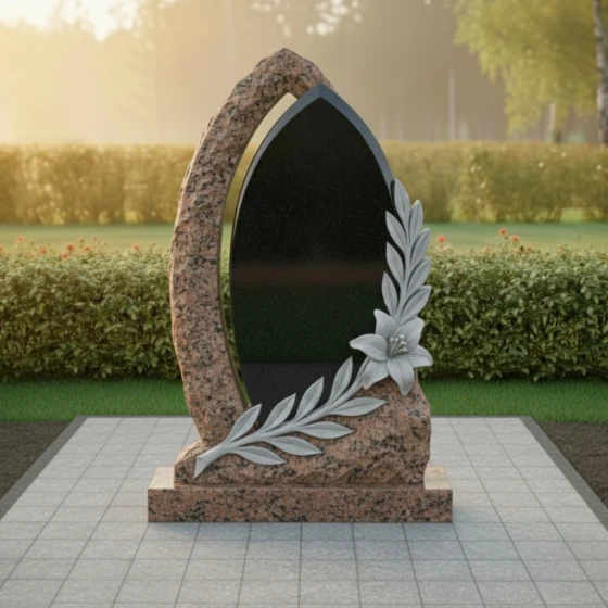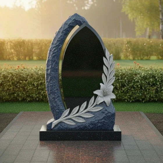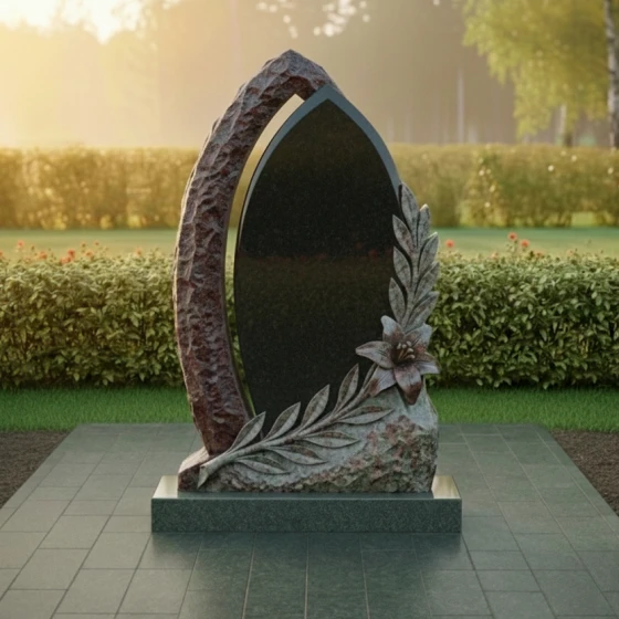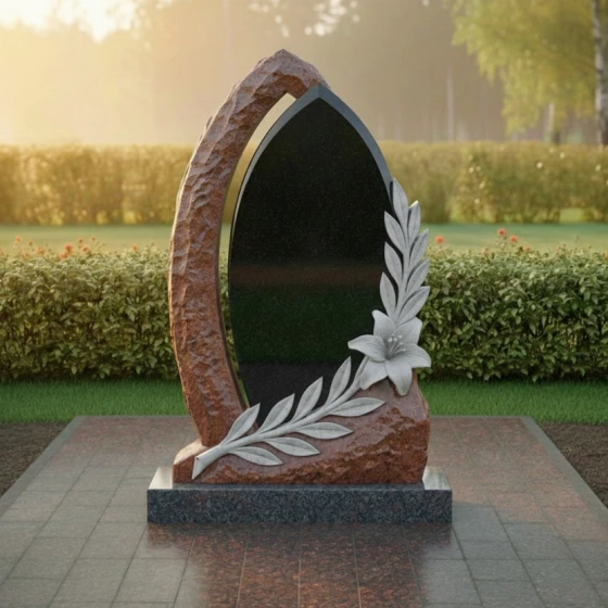 Оформление: Учитывая форму центральной части, для этой модели идеально подходит гравировка портрета в полный рост или крупного погрудного изображения. Благодаря высокому контрасту полированного камня, буквы, покрытые сусальным золотом или глубокой ручной гравировкой, будут выглядеть четко и торжественно. Лилия в нижней части композиции уже является самодостаточным декором, поэтому эпитафию лучше разместить лаконично, соблюдая баланс между текстом и художественными элементами.