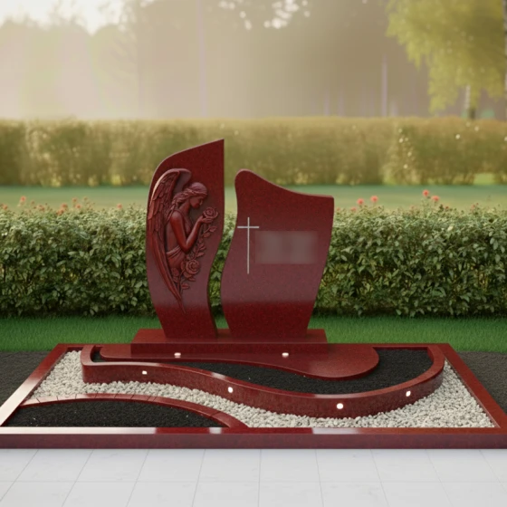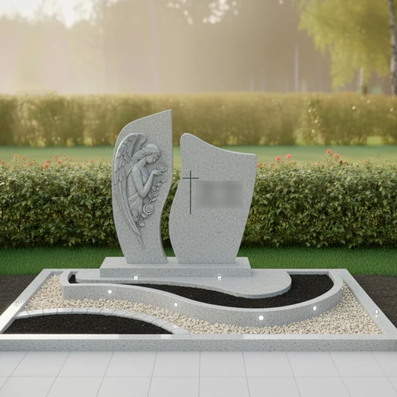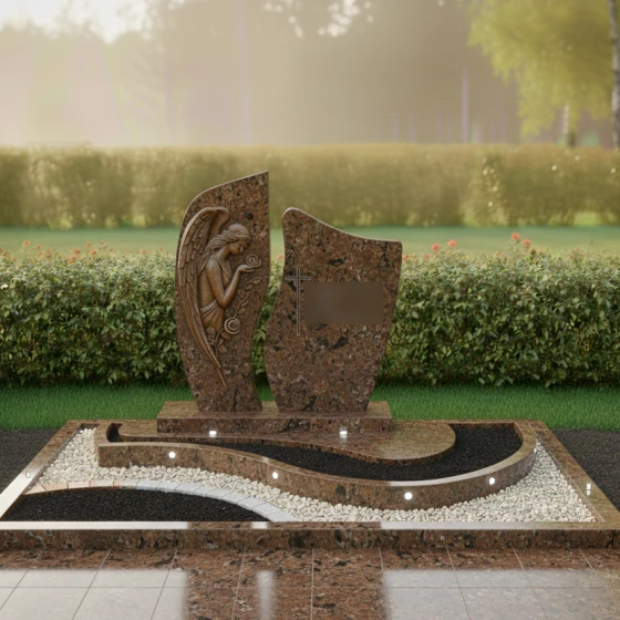 Каждая деталь этой модели наполнена глубоким смыслом. Ангел — это символ защиты, посредник между земным и небесным мирами, оберегающий покой усопшего. Роза в его руках традиционно олицетворяет чистоту души и вечную любовь, которая не увядает с годами. Асимметричная форма стелы и волнообразные линии в оформлении цветника напоминают о быстротечности времени и одновременно о его непрерывности. Сочетание строгой геометрии основания и мягких изгибов барельефа создает ощущение гармонии, даря утешение близким и подчеркивая статус мемориала как исключительного произведения ритуального искусства.