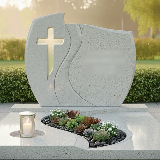 Визуальное решение стелы строится на гармоничном союзе двух асимметричных элементов, разделенных динамичным, плавным изгибом. Эта резная «волна», проходящая сквозь всё полотно камня, создает эффект движения и легкости, несмотря на значительный вес монумента. Левая часть композиции акцентирована лаконичным прорезным крестом, выполненным с идеальной геометрической точностью. Глубокая фаска по внутреннему контуру креста создает игру света и тени, придавая символу веры объем и визуальную значимость.
