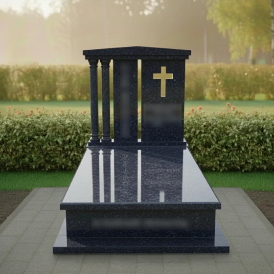 Данное ритуальное изделие представляет собой воплощение архитектурного благородства и художественной глубины. В основе композиции лежит сложная многоуровневая структура, напоминающая античный портал или вход в священную обитель. Левая часть стелы оформлена двумя изящными круглыми колоннами, которые поддерживают массивный венчающий карниз. Эти тонкие элементы создают удивительную игру ритма, пропуская через себя пространство и свет, что придает тяжелому камню легкость и возвышенность. Центральная часть композиции — вертикальная вставка из глубокого черного камня, которая служит идеальным контрастным фоном для всей конструкции, подчеркивая строгость и торжественность момента.