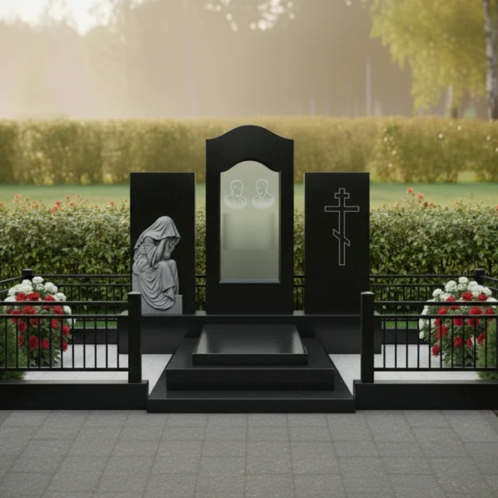 В основе композиции лежит безупречная симметрия и архитектурная выверенность. Центральное место занимает вертикальная стела с мягким арочным навершием, напоминающим небесный свод или портал в вечность. По бокам от неё расположены два дополнительных гранитных блока, каждый из которых несет свою художественную нагрузку. Левая часть украшена детально проработанной скульптурой «Скорбящей матери». Мастерски исполненная резьба передает каждую складку ниспадающей плащаницы, создавая эффект мягкой ткани, застывшей в камне. Фигура, склоненная в тихой печали, привносит в ансамбль особую человечность и эмоциональную глубину.