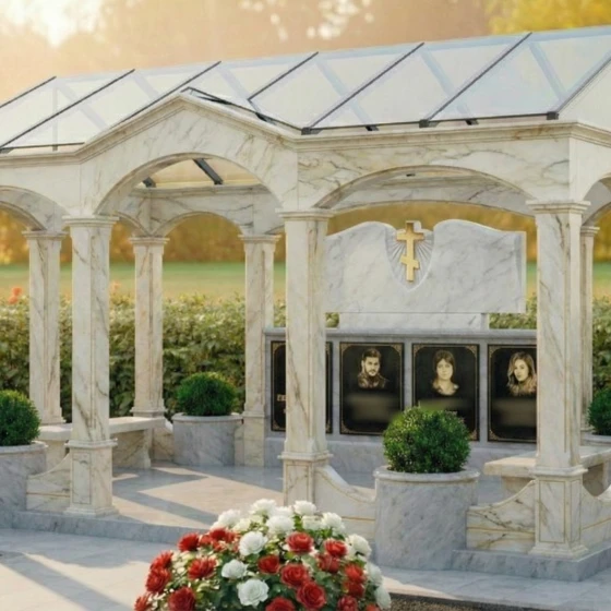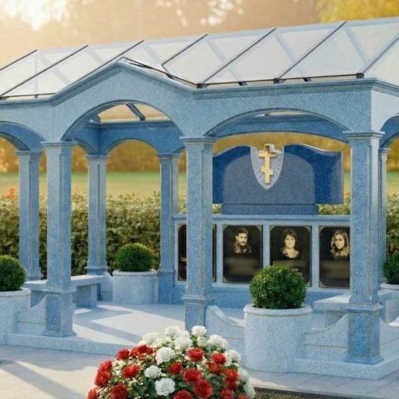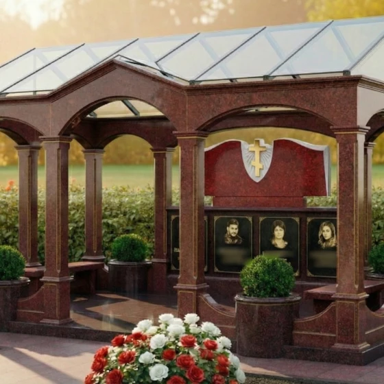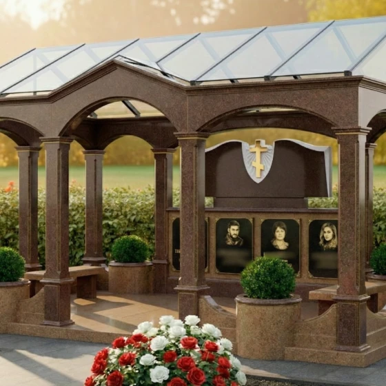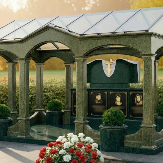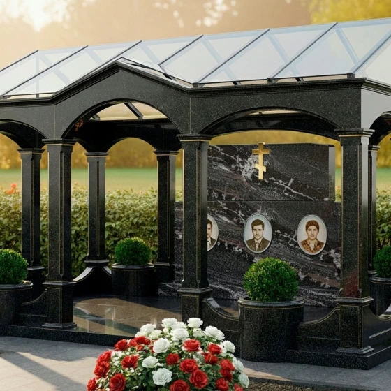 Особое внимание привлекает уникальная светопрозрачная кровля на гранитном каркасе. Стеклянный купол, выполненный в виде двускатной крыши, создает игру света и тени, наполняя внутреннее пространство мемориала легкостью и «воздухом», при этом надежно защищая центральную часть от осадков. Архитектура изделия опирается на строгую геометрию: мощные квадратные колонны с изящными капителями поддерживают триумфальные арки, символизирующие врата в иной мир. Плавные изгибы арок эффектно контрастируют с острыми гранями скатов крыши, создавая гармонию между земной устойчивостью и небесным стремлением.