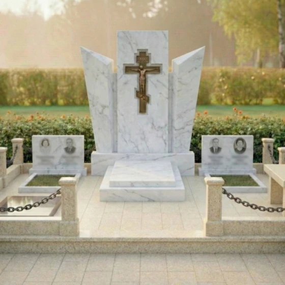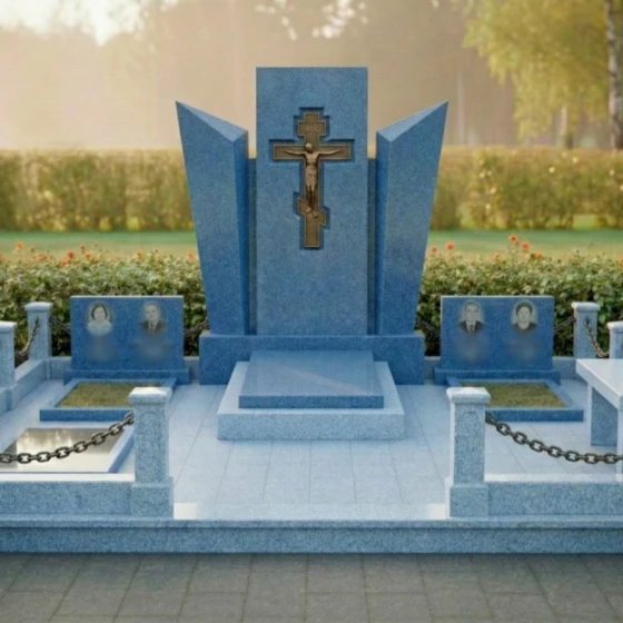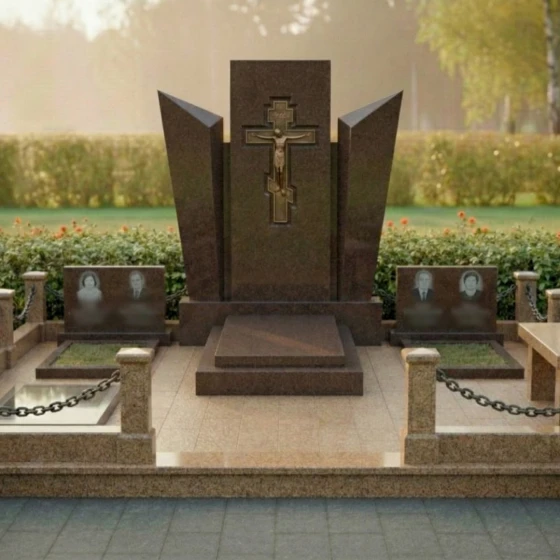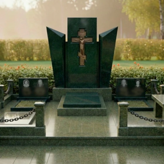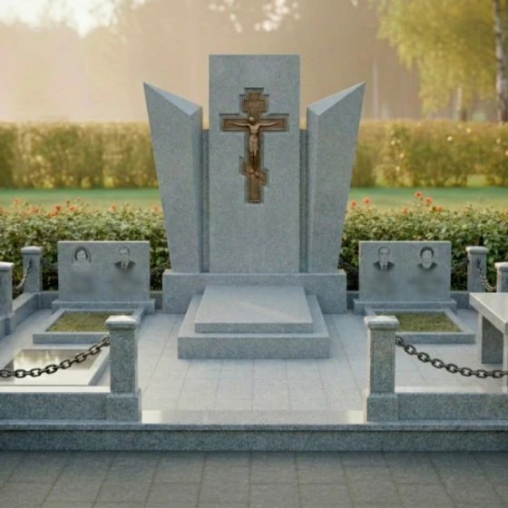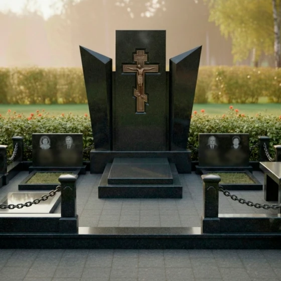 Кому подойдет: Данный мемориальный ансамбль является идеальным выбором для оформления семейного захоронения (на три или четыре человека). Благодаря своей монументальности и сложной архитектурной форме, он подходит для почтения памяти главы семьи или уважаемого человека, чья жизнь была примером крепости духа и верности традициям. Это решение для тех, кто ищет не просто памятник, а долговечный символ родовой памяти, который сохранит свою величественность для многих последующих поколений.
